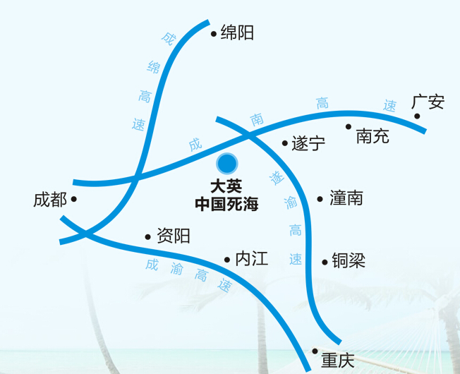 “中国死海”所在地大英县地处四川盆地的中心地带,距离四川省会成都约114公里,距重庆市直线约180公里,距遂宁市22公里,距绵阳市130公里,距德阳市90公里,距南充市约94公里,内江100公里。达(州)成(都)铁路、成(都)南(充)高速公路、绵(阳)重(庆)高速公路、遂渝怀高速等傍城而过。