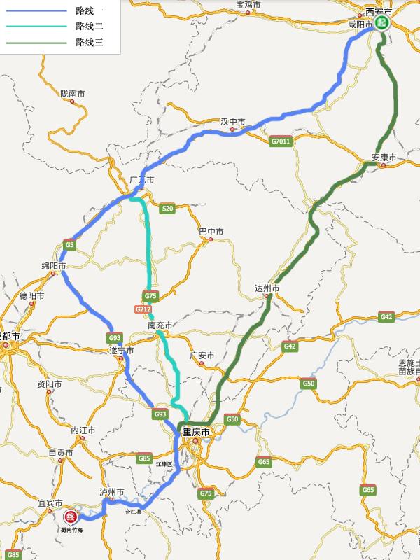 西安——汉中——广元——绵阳——遂宁——重庆——江津——合江县——泸州——纳溪——江安县(怡乐站下高速)——蜀南竹海