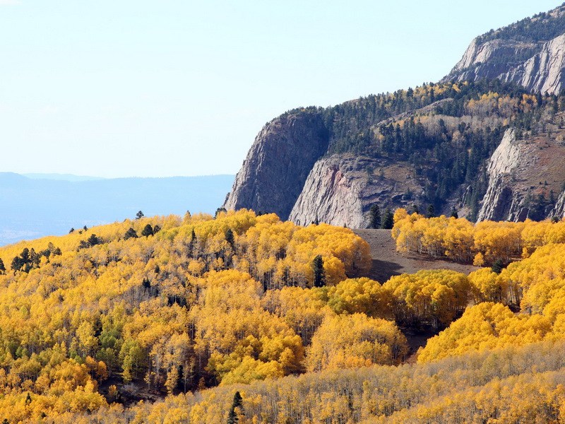 新墨西哥州的高原适合秋天散步,因为那时山杨树会变成灿烂的金黄色,如图正是卡森国家森林公园布拉索斯河悬崖下的树景。