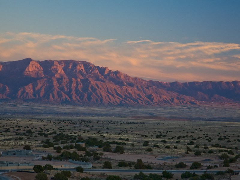 新墨西哥州的桑迪亚山脉在沙漠中连绵起伏,高高耸立在阿尔伯克基市附近。日落时分,山脉呈现出美丽的色彩带,有紫色、粉红色和红色。“桑迪亚”在西班牙语中的意思是西瓜。