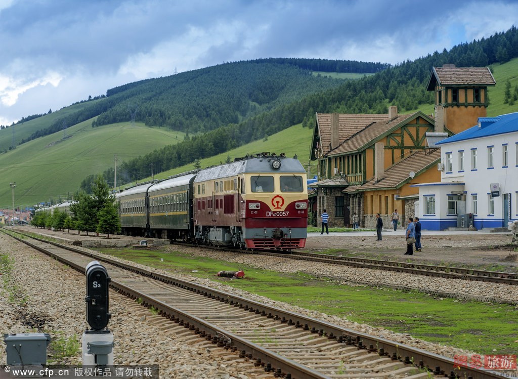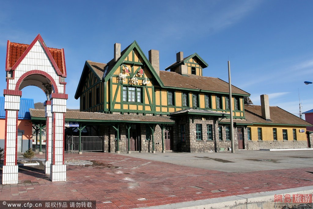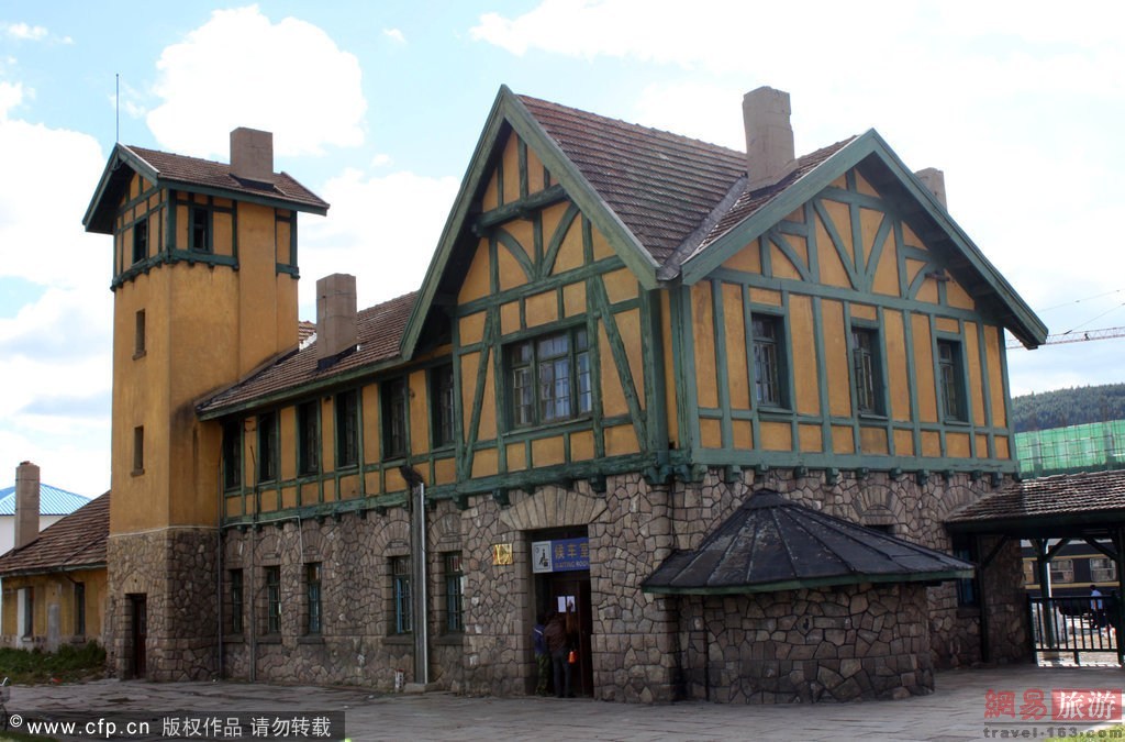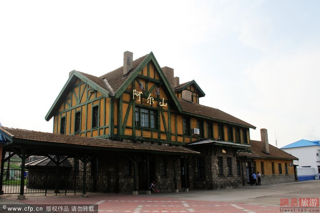 内蒙古,阿尔山风光,阿尔山火车站,修建于1937年,是一幢东洋风格的日式建筑,是用砖、木材、花岗岩、钢筋混合建造的两层建筑物,一层外壁周围是用花岗岩堆砌的乱插石墙,楼顶用赭色水泥涂盖。