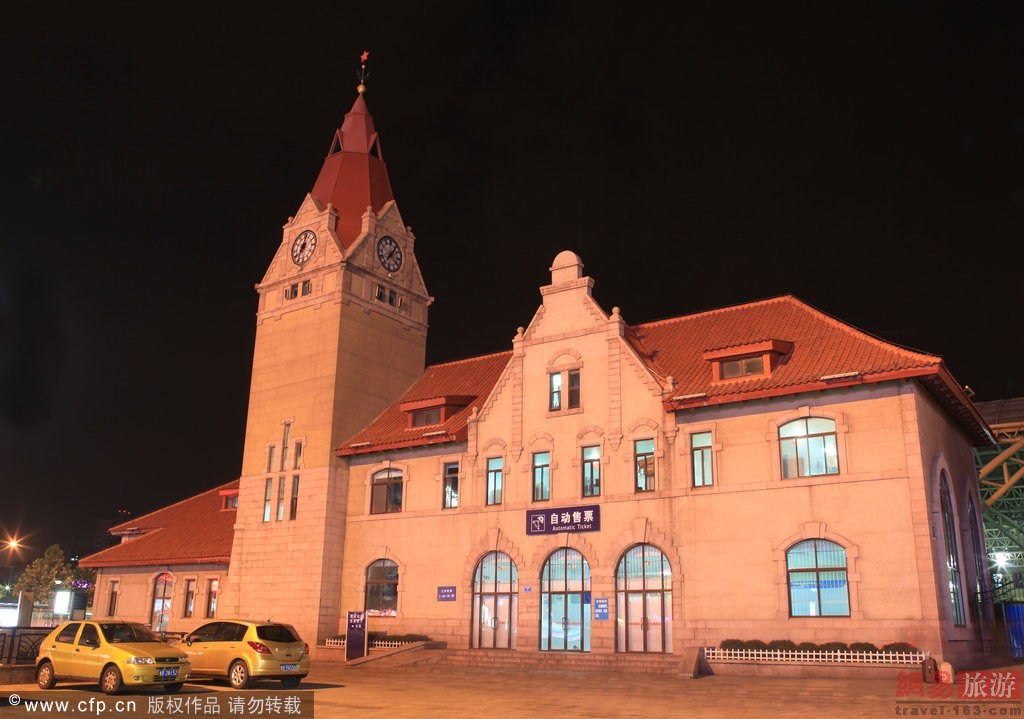青岛火车站夜景。