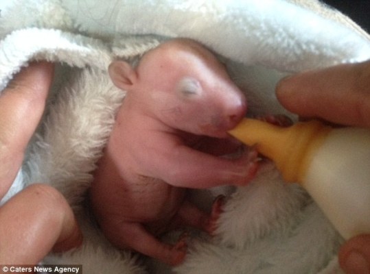 一只刚出生的袋熊宝宝在失去妈妈后被人“收养”,它光着身子闭眼喝奶的丑萌照蹿红网络。