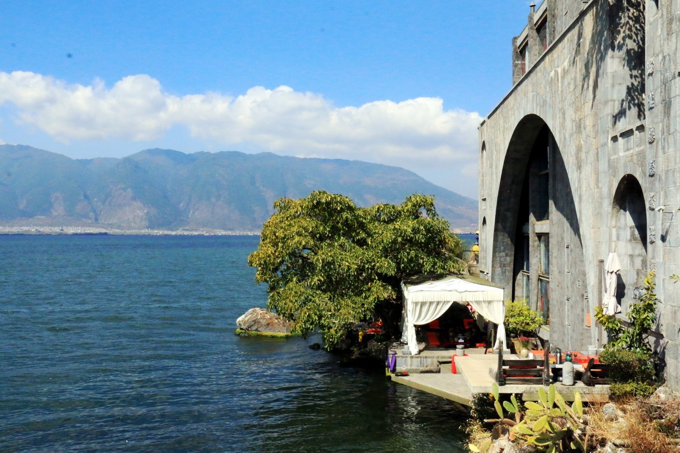 青庐的门对面便是太阳宫,同样的用石头围着一株百年大榕树而造。这里有着最美的阳台,眼前是空阔的洱海,南诏风情岛像一艘翠绿的大船,静静泊在海面,一两艘小船仿佛怕视线过于寂静,特意前来点缀,来了,又去了。