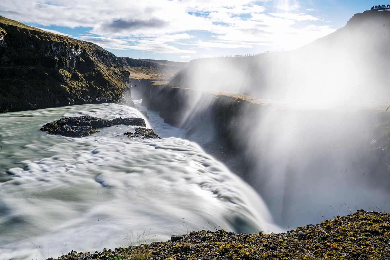 居德瀑布(Gullfoss),也叫黄金瀑布,是雷克雅未克周边一日游黄金圏路线的三个景点之一(黄金圈还包括间歇泉和议会旧址)。黄金瀑布位于冰岛首都雷克雅未克以东北125公里外,奥富萨(Olfusa)河支流赫维陶(Hvita)河上,宽2500米,高70米,为冰岛最大的断层峡谷瀑布,塔河在这里形成上、下两道瀑布,下方河道变窄成激流。1975年农庄主人将它送给冰岛政府作为自然保留区。在阳光的照射下,瀑布喷溅的水珠折射出一道彩虹,散发着锻金般的光彩,瀑布也因此得名。夏季找到好的角度,可以拍到彩虹。电影《普陀米修斯》和《星际穿越》曾在此取景。