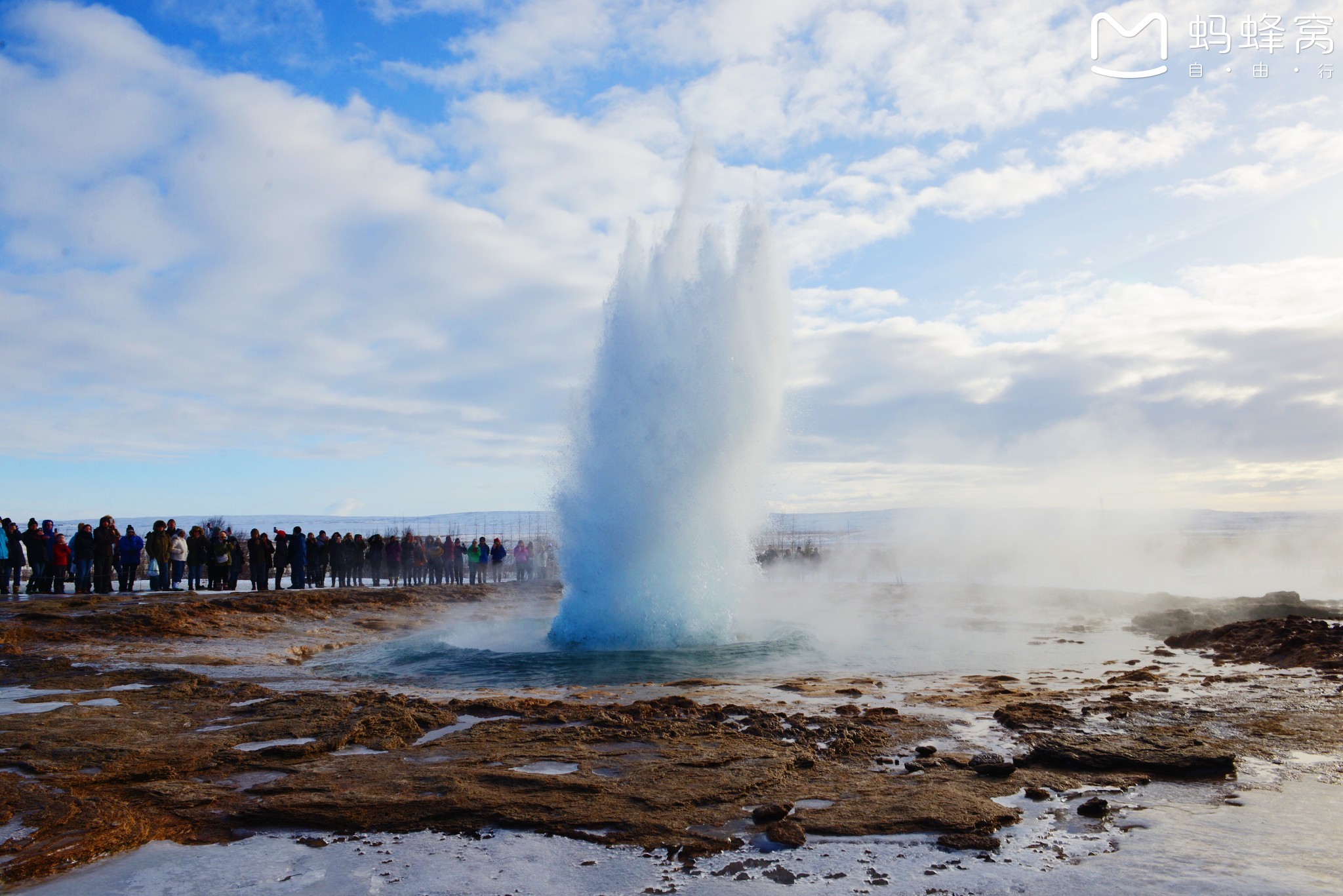 大间歇泉(Great Geysir),位于地热活跃的豪卡道鲁山谷(Haukadalur Valley),是冰岛最大的间歇泉,也是雷克雅未克周边一日游黄金圏路线的三个景点之一。间歇泉,顾名思义,是间歇喷发的温泉,多发生于火山运动活跃的区域。英语中,间歇泉是“geyser”,即得名于冰岛语Geysir。大间歇喷泉是一个直径约18米的圆池,水池中央的泉眼直径有10多厘米,泉眼内水温高达百度以上。每次喷发之际,只听洞内隆隆作响,渐渐地,响声越来越大,而沸水也随之升涌,最后冲出洞口,向高空喷射,水柱变成蒸汽直冲上天空约二三十米高,又随即化作琼珠碎玉落下。每次喷发过程大约持续1~2分钟,然后渐归平息。这一过程周而复始,不断反复,十分壮美。