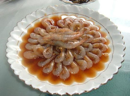 俗称"水晶虾",为淡水虾,身体长形,外披甲壳,活体呈现青绿色,带有棕色斑点,薄而透明,故名。虾的头部有长短一角各一对,有密排的细足,把它投入盆 中,会向台面四面八方跳跃,故被人们称作"满台飞"。"满台飞"在锦溪的湖泊、河塘中到处有产,尤以夏令时节的"籽虾"为最佳,因"黄满子"多,虾子酱油 即选用这时的河虾。锦溪名菜"满台飞"(即醉虾),一般都选择春、秋两季的水晶虾作为原料,凡品尝过的人,都感到味道特别鲜美。黑蚬汤、水晶虾、塞肉鱼等 地道的水乡菜,清淡但极其鲜美。