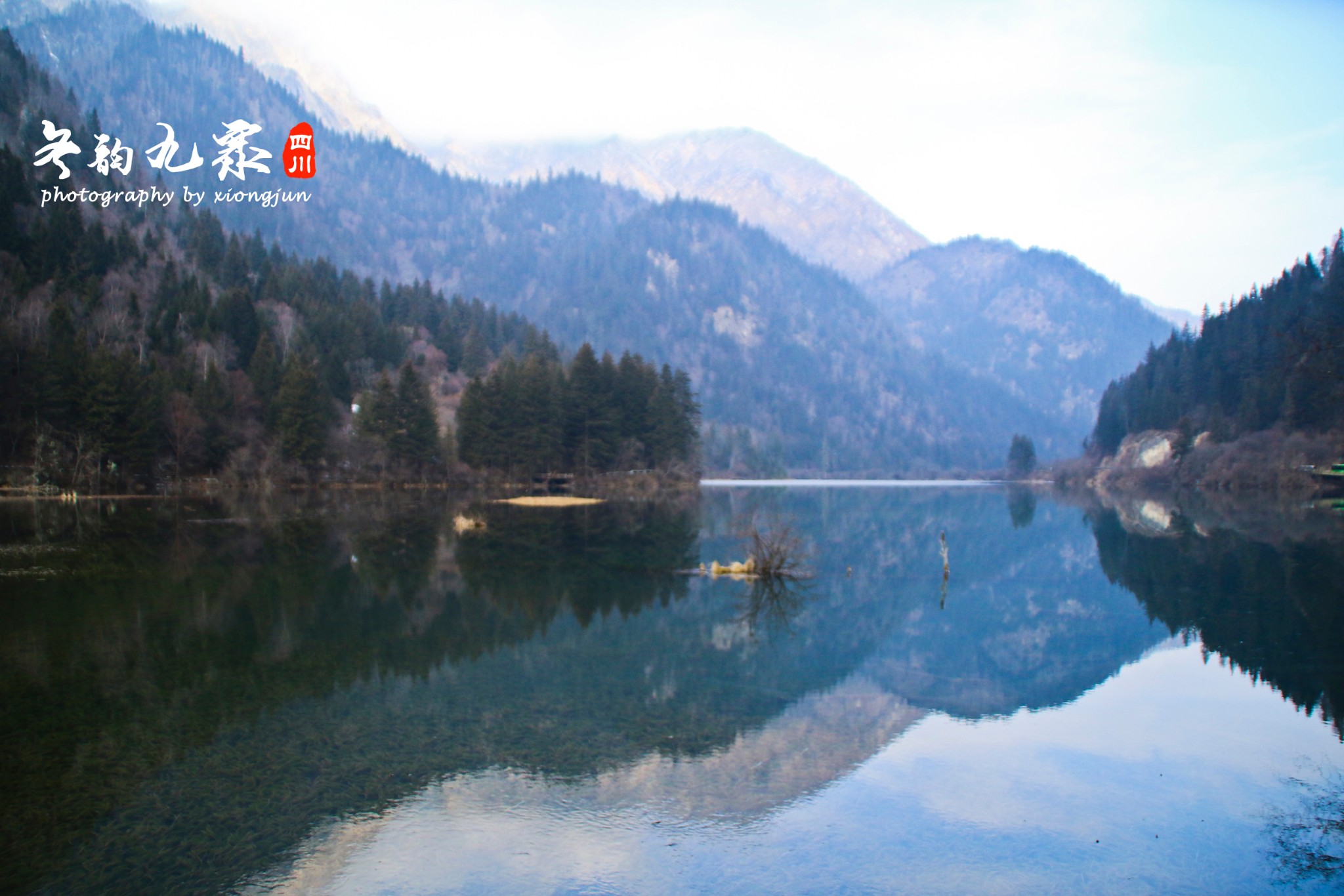 我们的第一站箭竹海到了,一下观光车就看到此景,水中山峦对峙,现在虽是严冬,一汪湖水仍然波光粼粼,充满了生气,好一幅迷人的风景画。能看出我们是第一批上来的游客,这宁静的画面还没有被打破,我和我的小伙伴都惊呆了,静静呆了好久才想起要拍照呢。