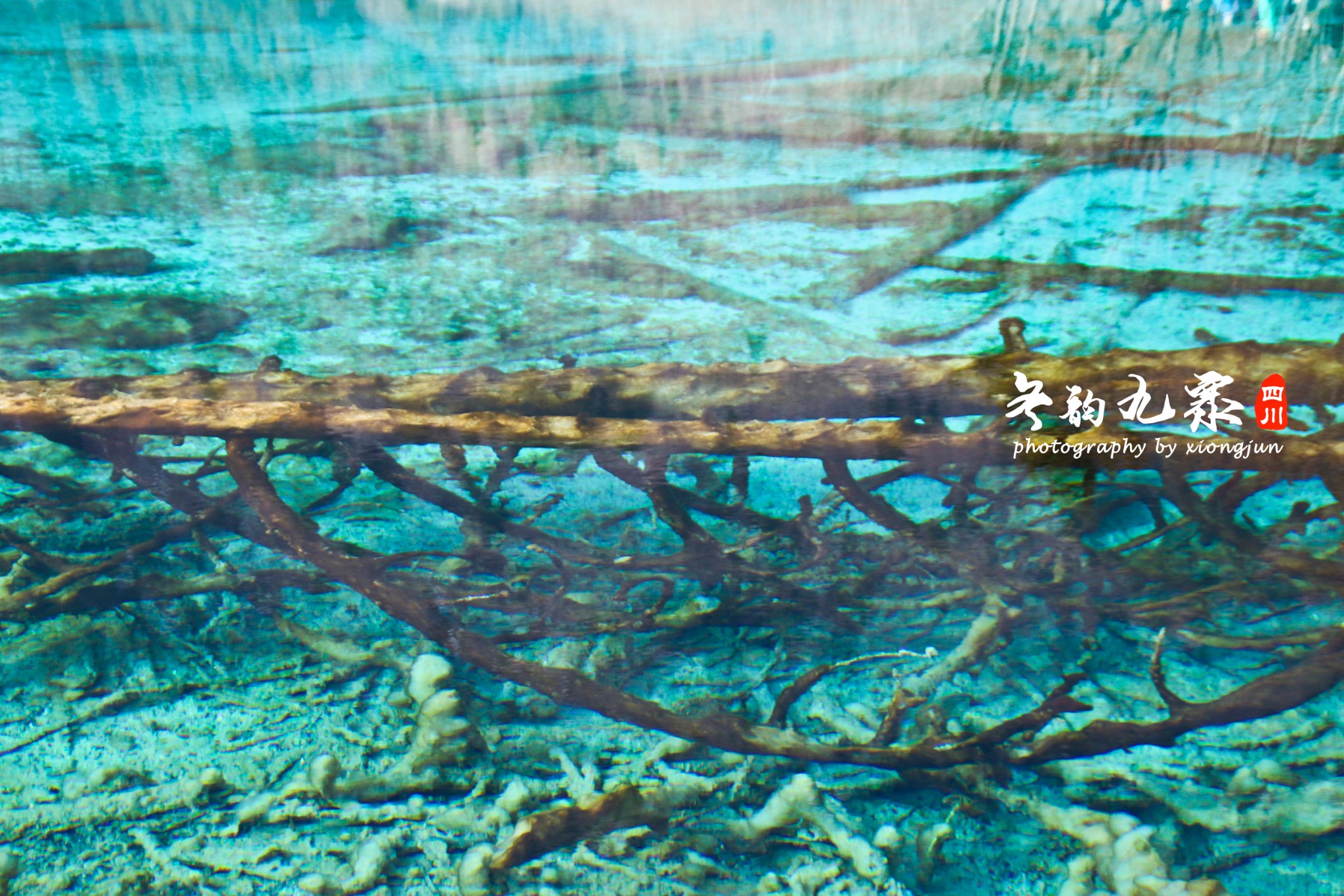 湖水越来越深,水深已经接近20米,这里是湖水最深的地方,不久令人感到惊奇的现象出现了,湖底有好似火山口一样的地方,坑的中心水不断地涌出,水经过岩层的时候带入了大量石灰钙华物质,这些含有钙华物质的白色砂粒就像是热带珊瑚海中的砂子一样堆积着,形成了如梦如幻的海底景观。