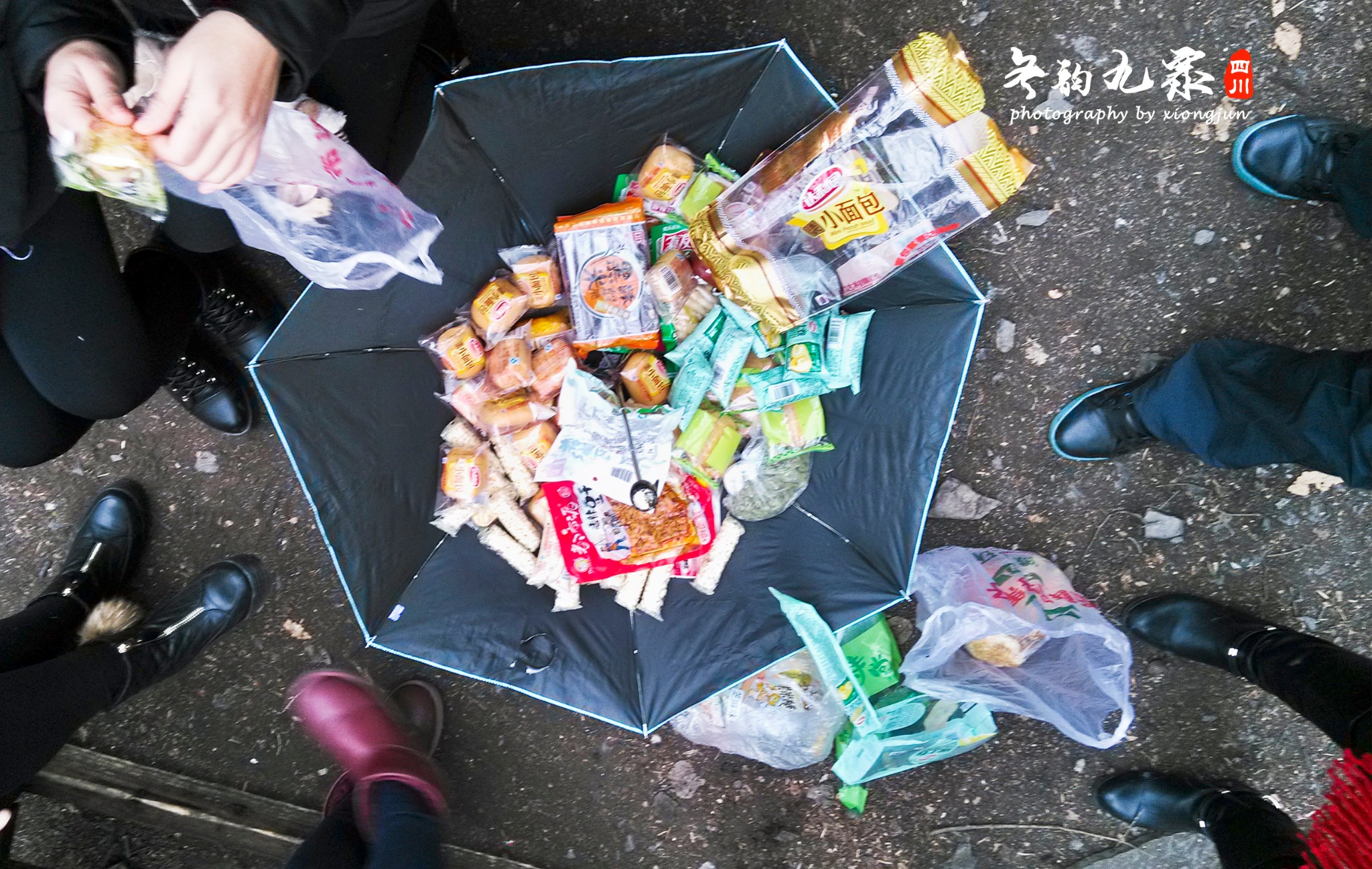 ▲▲现在已经是中午1点了,大家都饿了,找了一个有座椅的地方准备吃午饭。你没有看错,撑开一把伞,大家都把自己包了带的零食都翻了出来,组成了我们今天丰盛的午餐,哈哈哈。出发前我们也考虑过带泡面,但是不知道去哪来找开水,然后就放弃了。这样也挺好的,随时随地想吃就吃。