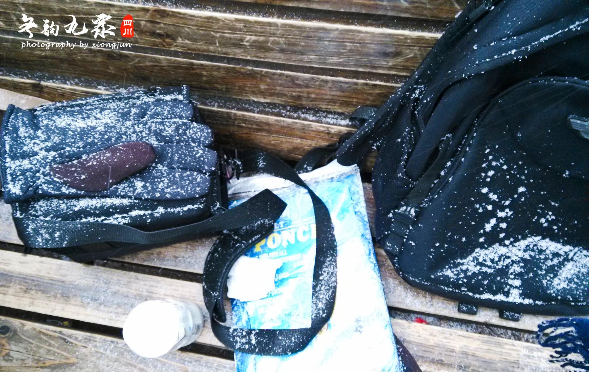 ▲▲飘落的雪花在身上不会马上融化,雪中也不带雨水,不像在城市里下的雪都是雨夹雪,索性大家都不管,雪花落在头上衣服上也不怕,所以大家一会变白了头,哈哈哈。吃饭的时候放在椅子上的这些手套和背包也差点被雪给覆盖了。