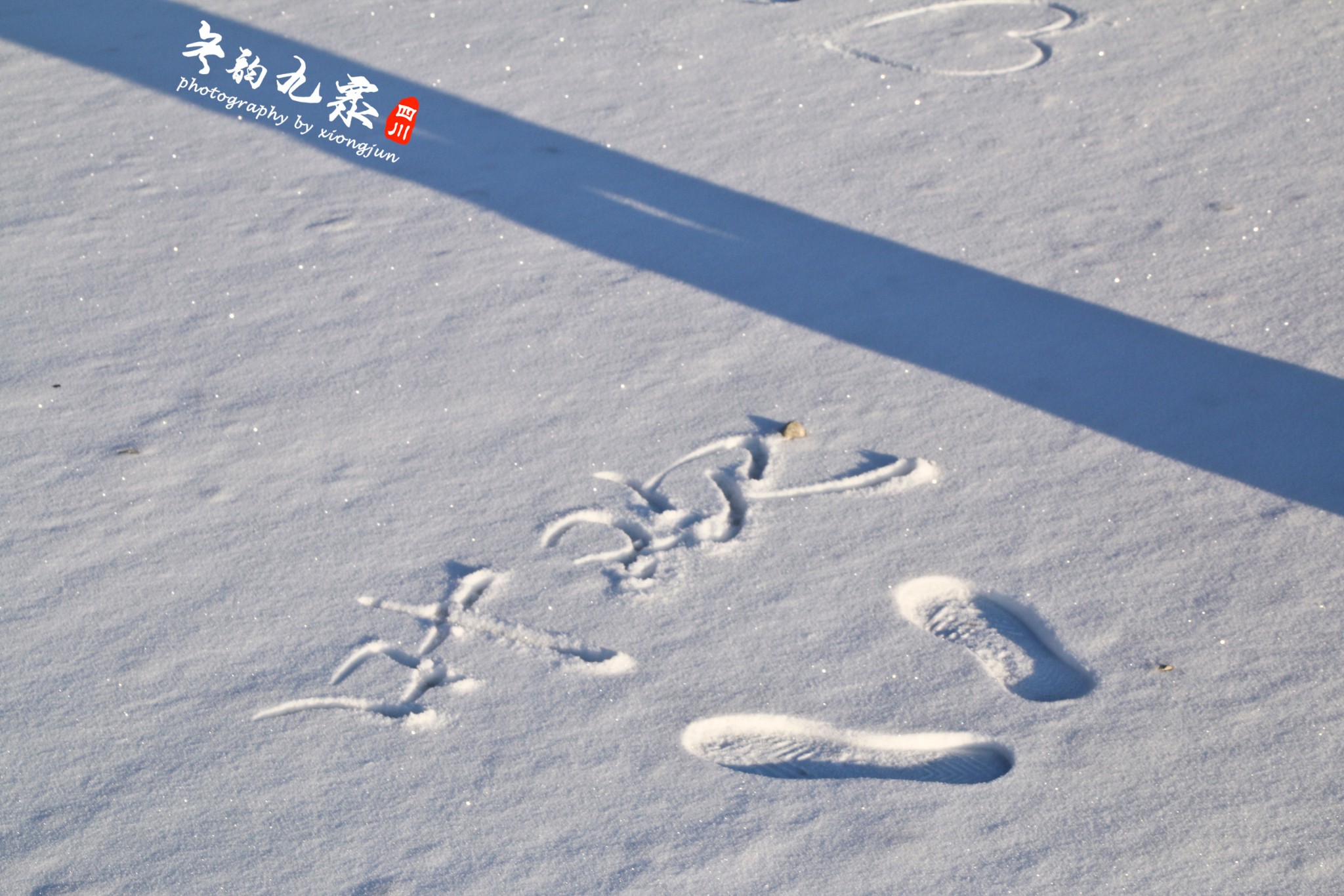 ▲▲早晨的太阳把人的影子拉得很长很长。在雪地上写上自己的名字(当然图上不是我的名字),留下自己的脚印,带走的确实满满的回忆。