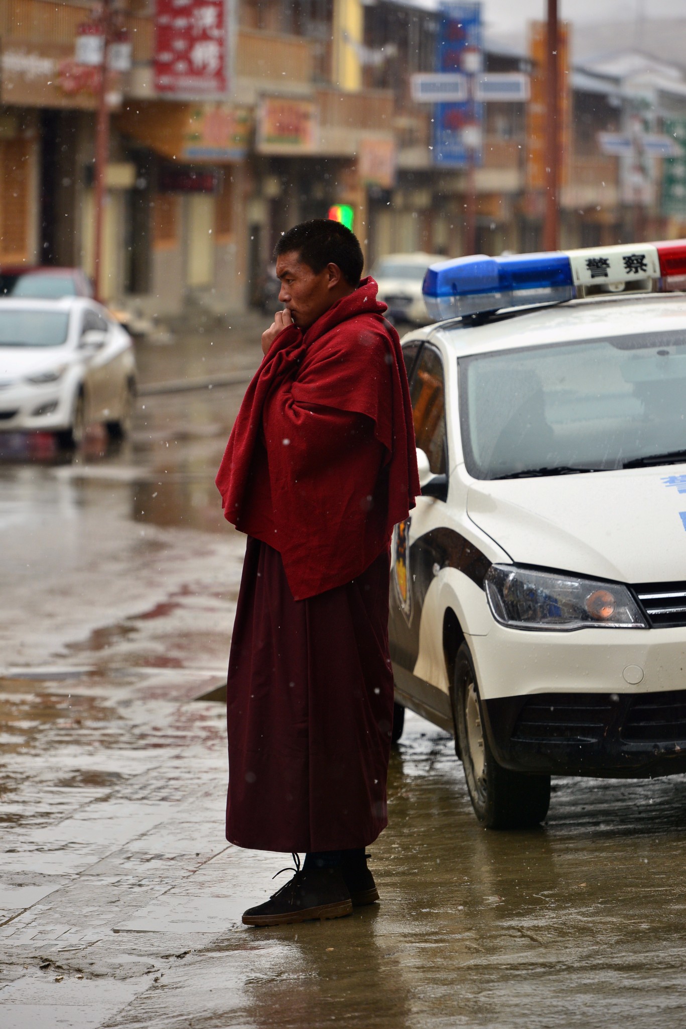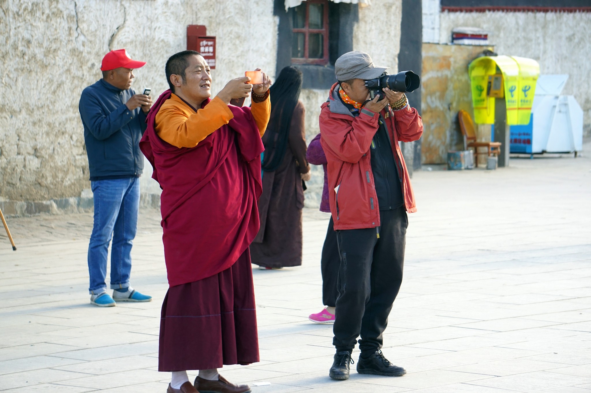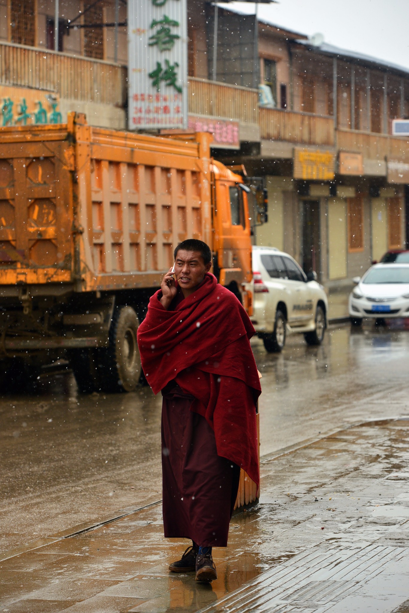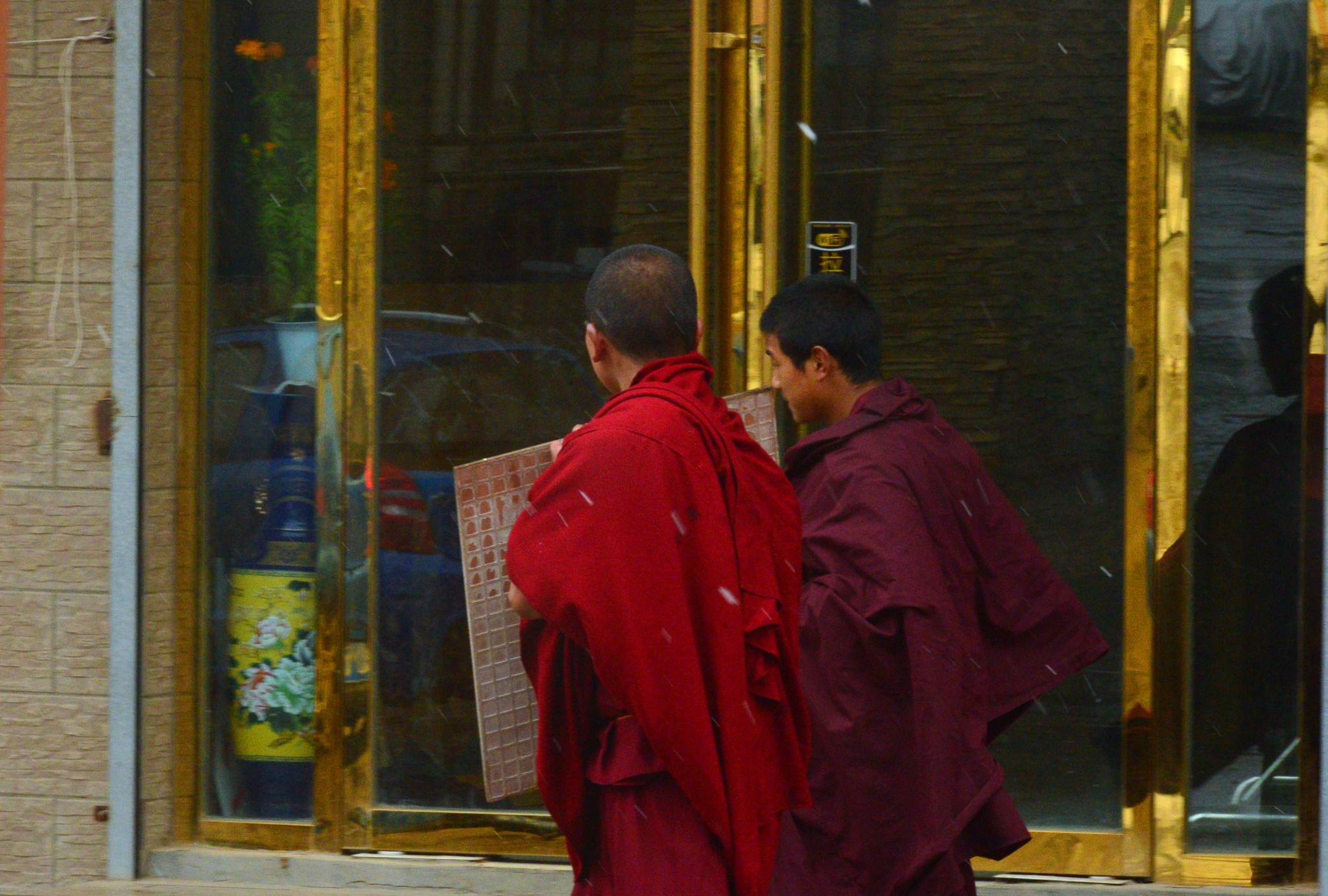 隔着玻璃从西餐厅往外看去,有一年龄不大的喇嘛站在路边,嘴上含着牙签,耳边贴着手机,一付酒肉穿肠过、佛祖心中留的样子。