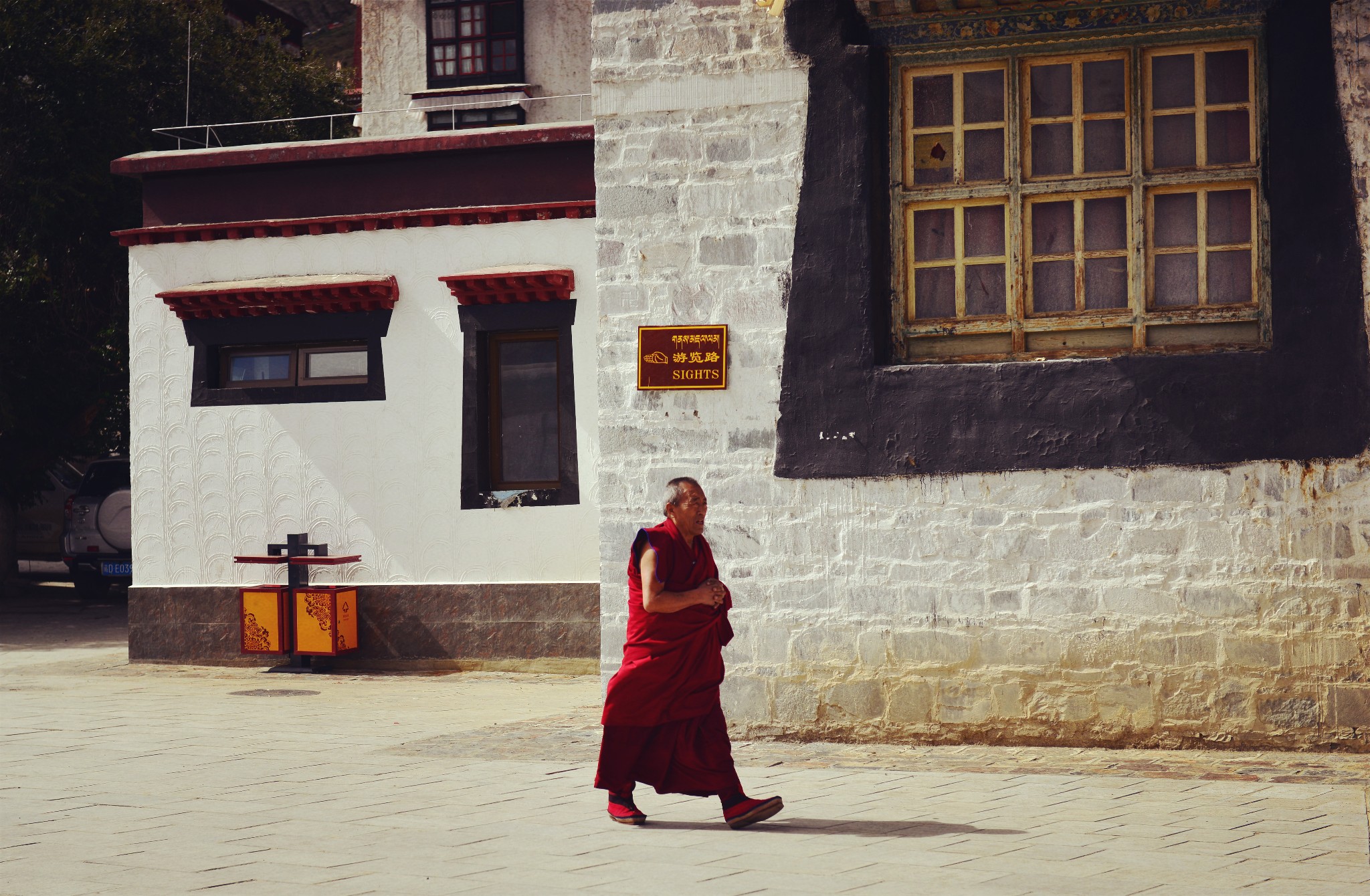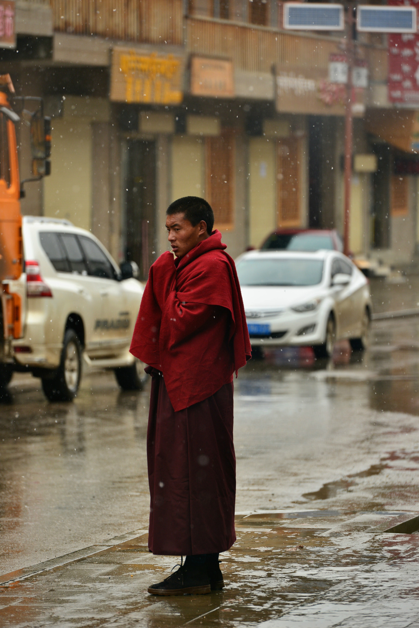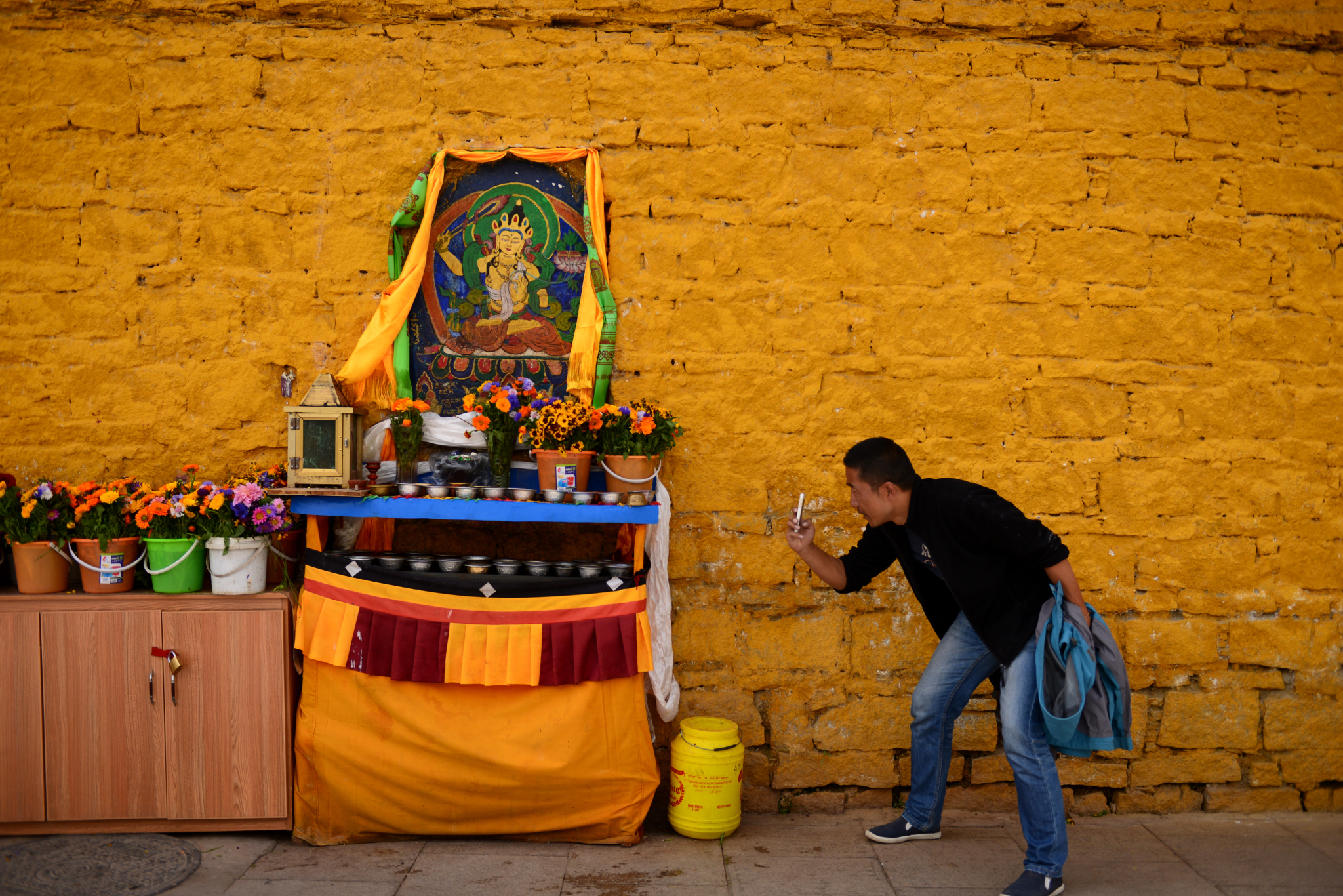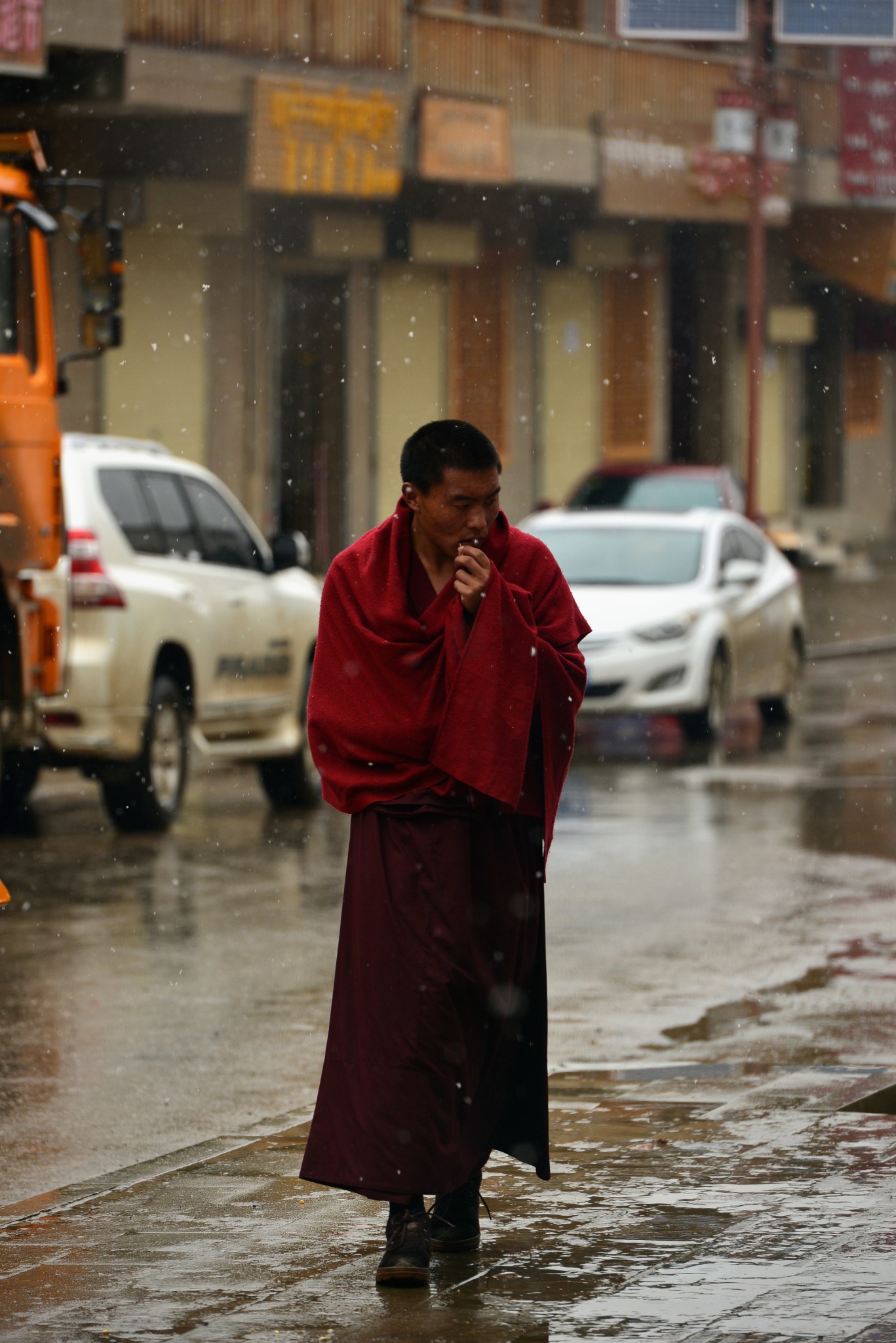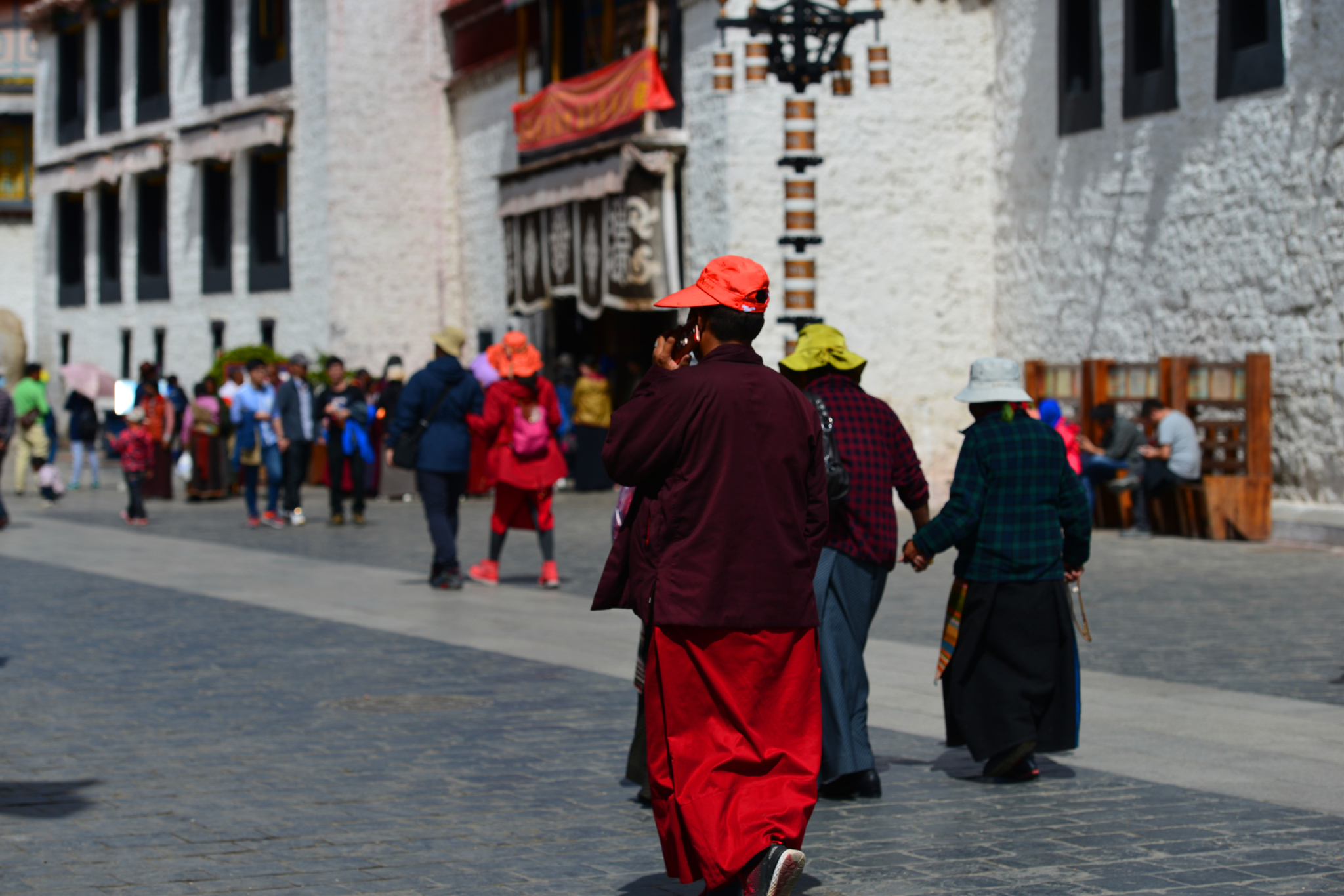 隔着玻璃从西餐厅往外看去,有一年龄不大的喇嘛站在路边,嘴上含着牙签,耳边贴着手机,一付酒肉穿肠过、佛祖心中留的样子。