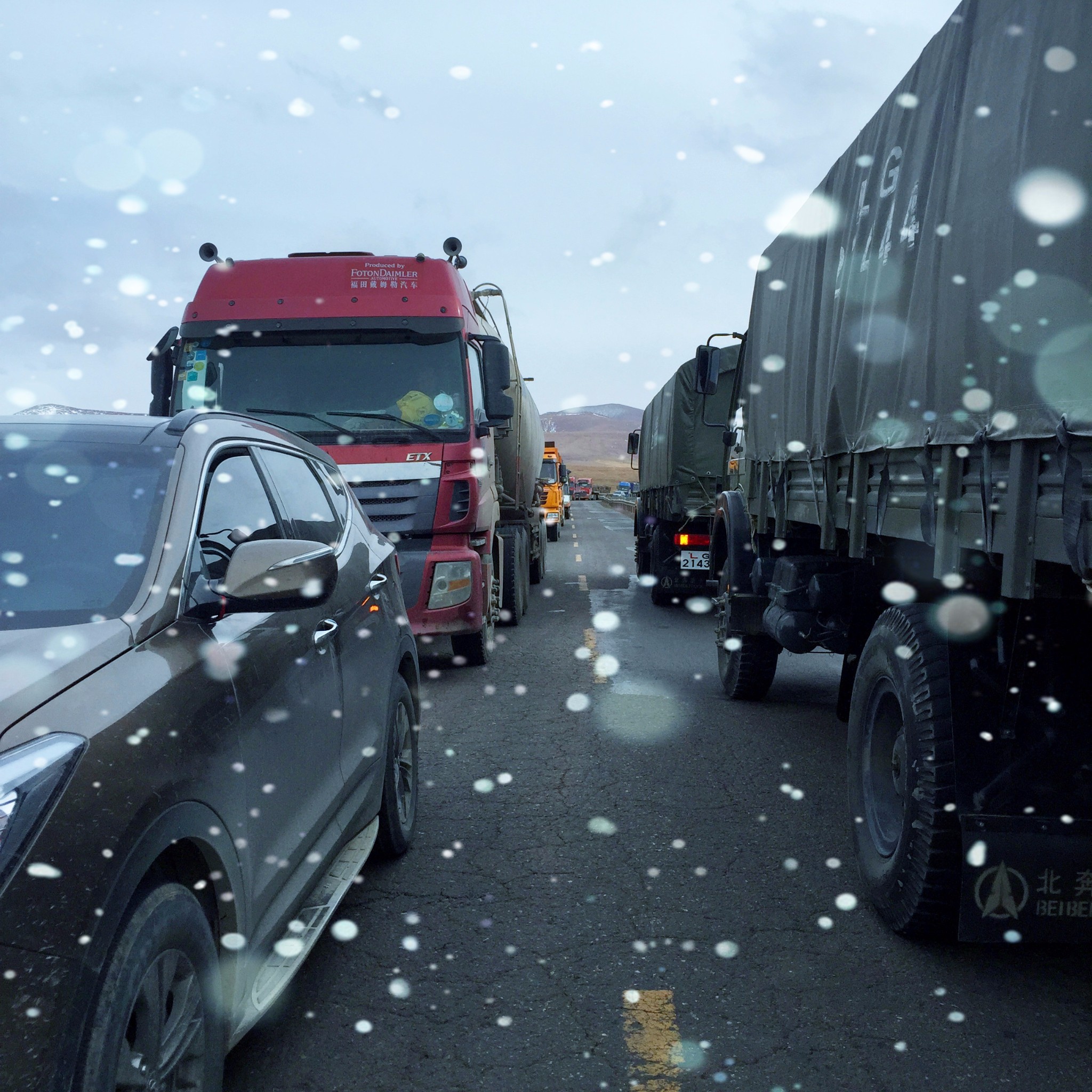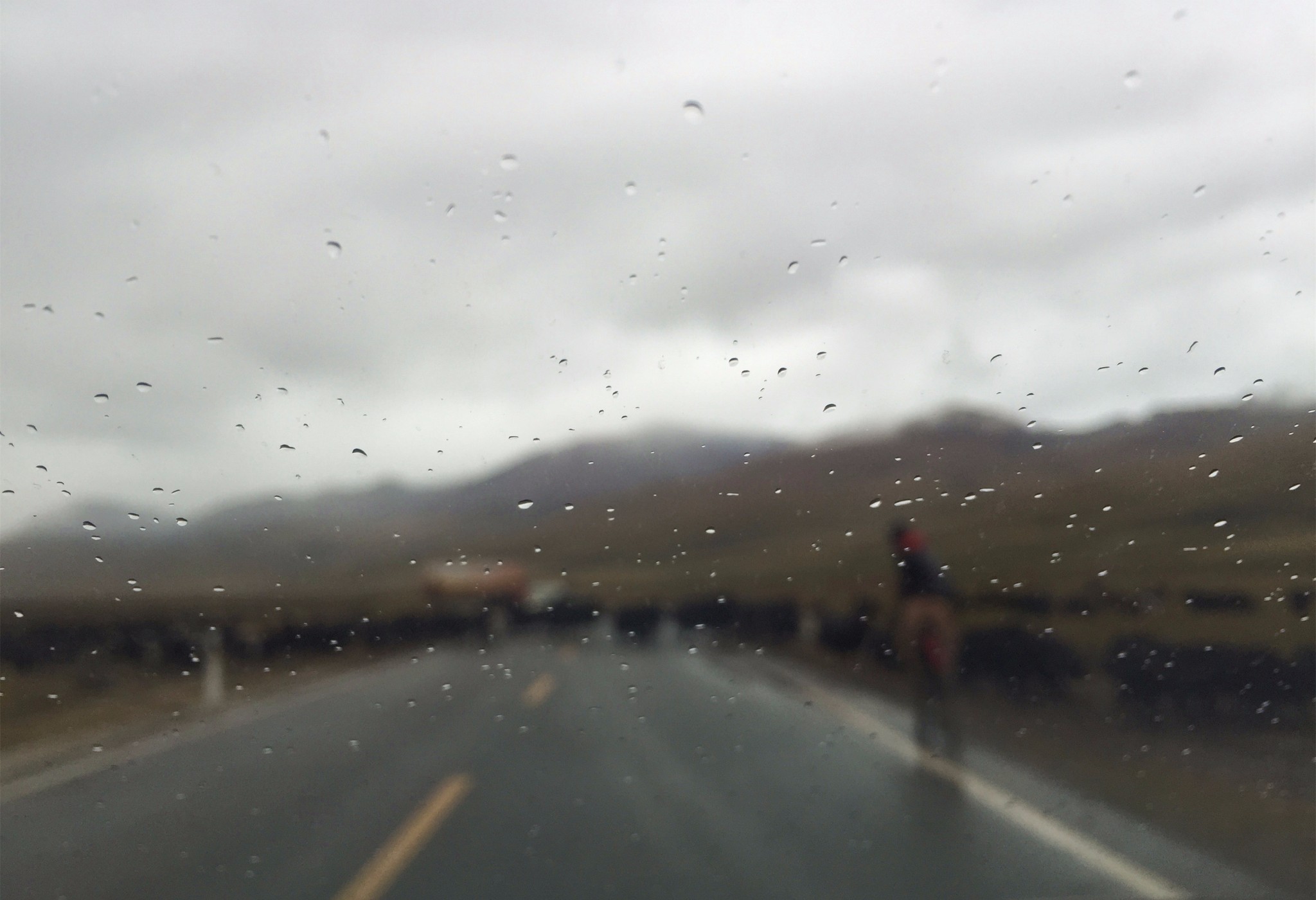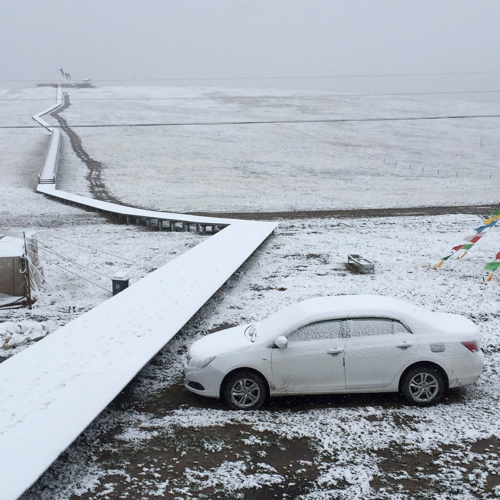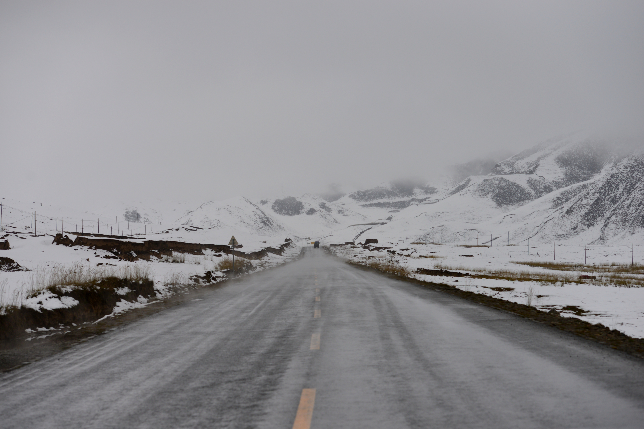 早上从茶卡镇出发,沿G6京藏高速而行,没多远,开始下雨,过共和县后又开始飘雪。