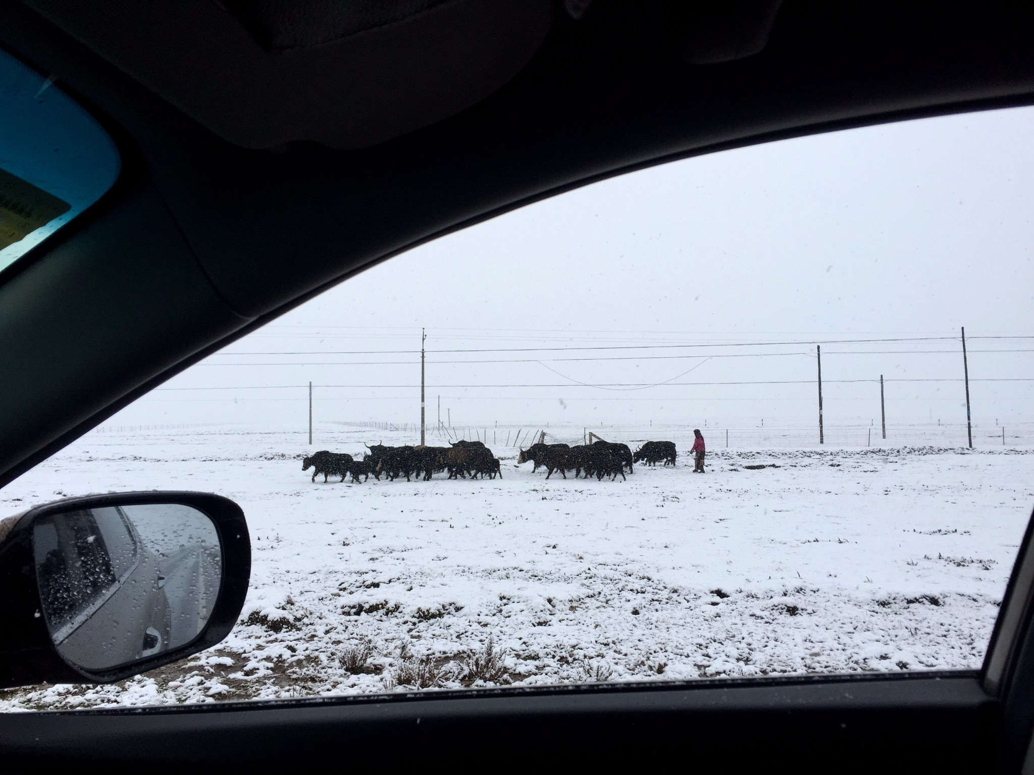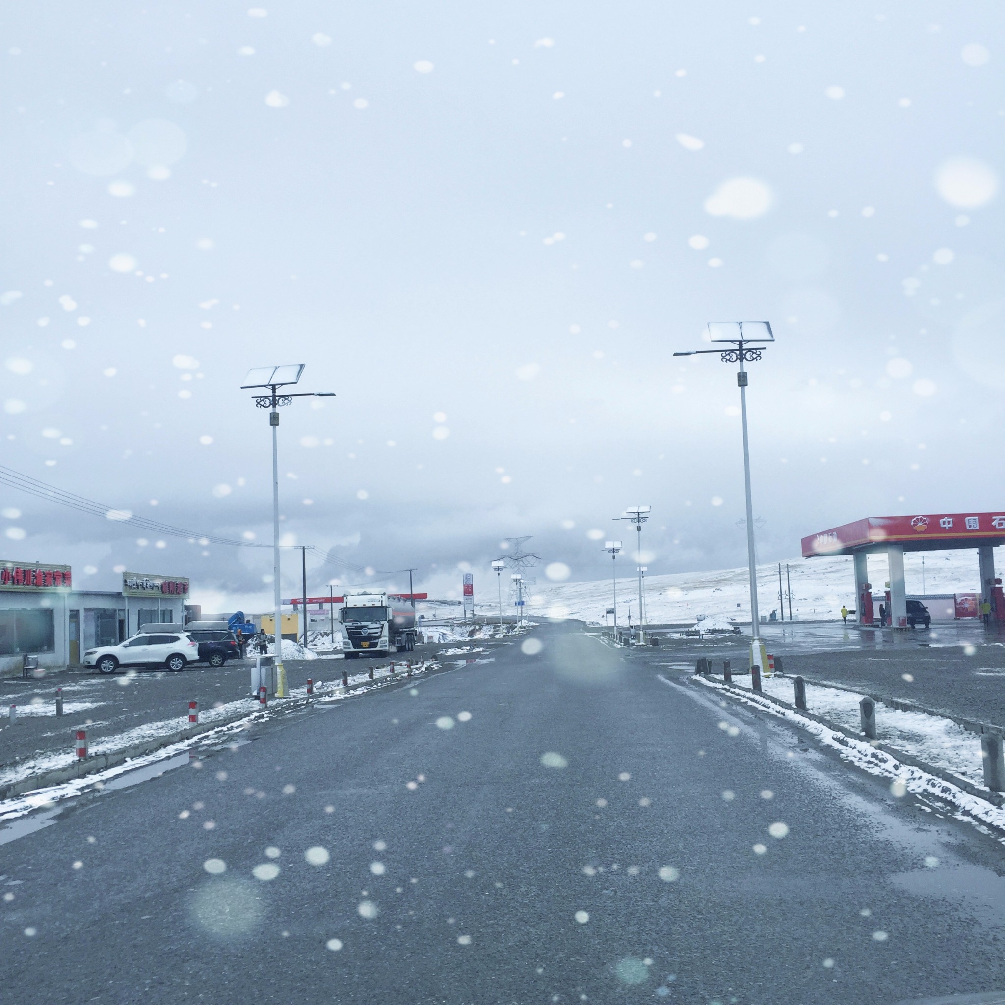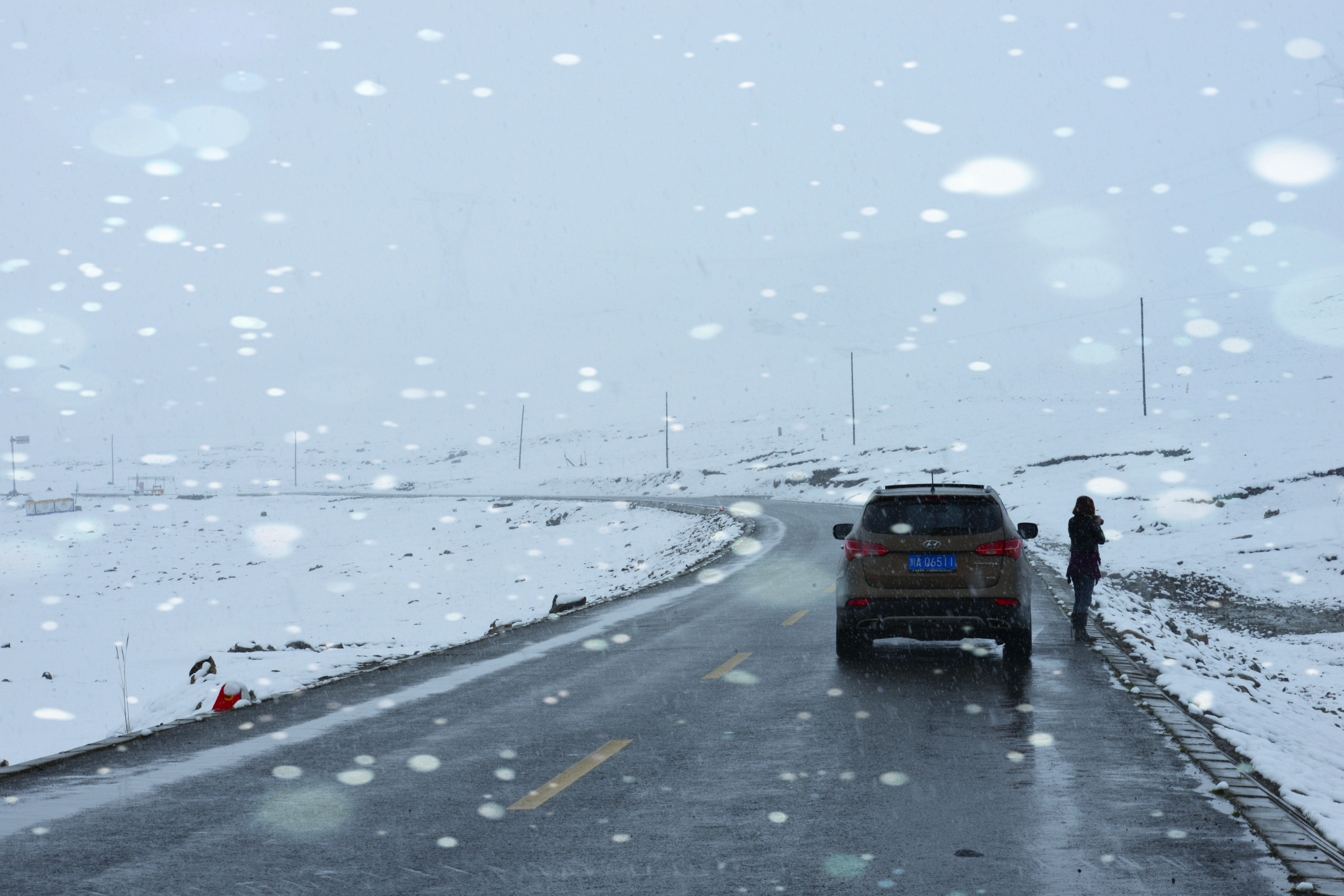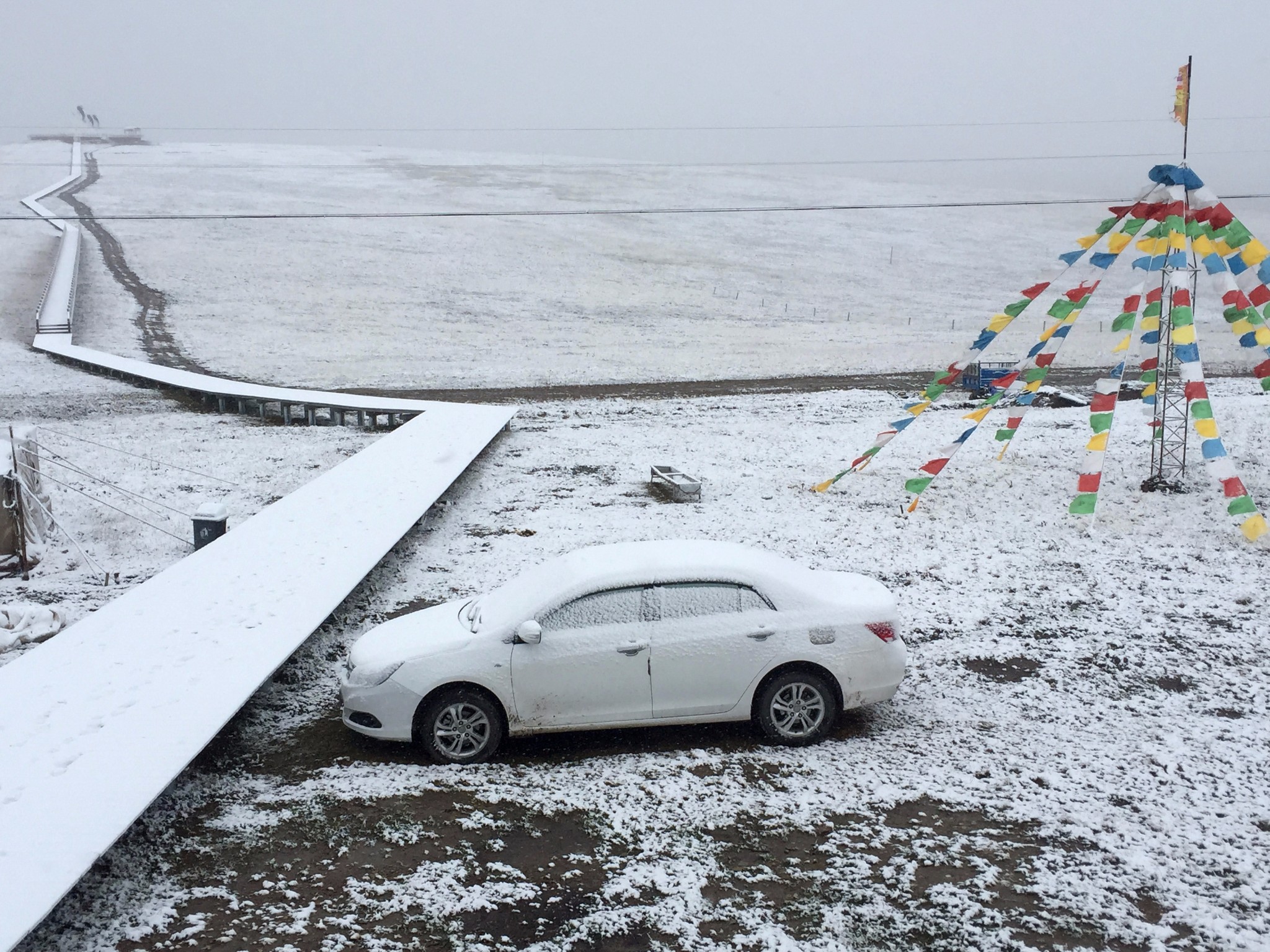早上从茶卡镇出发,沿G6京藏高速而行,没多远,开始下雨,过共和县后又开始飘雪。