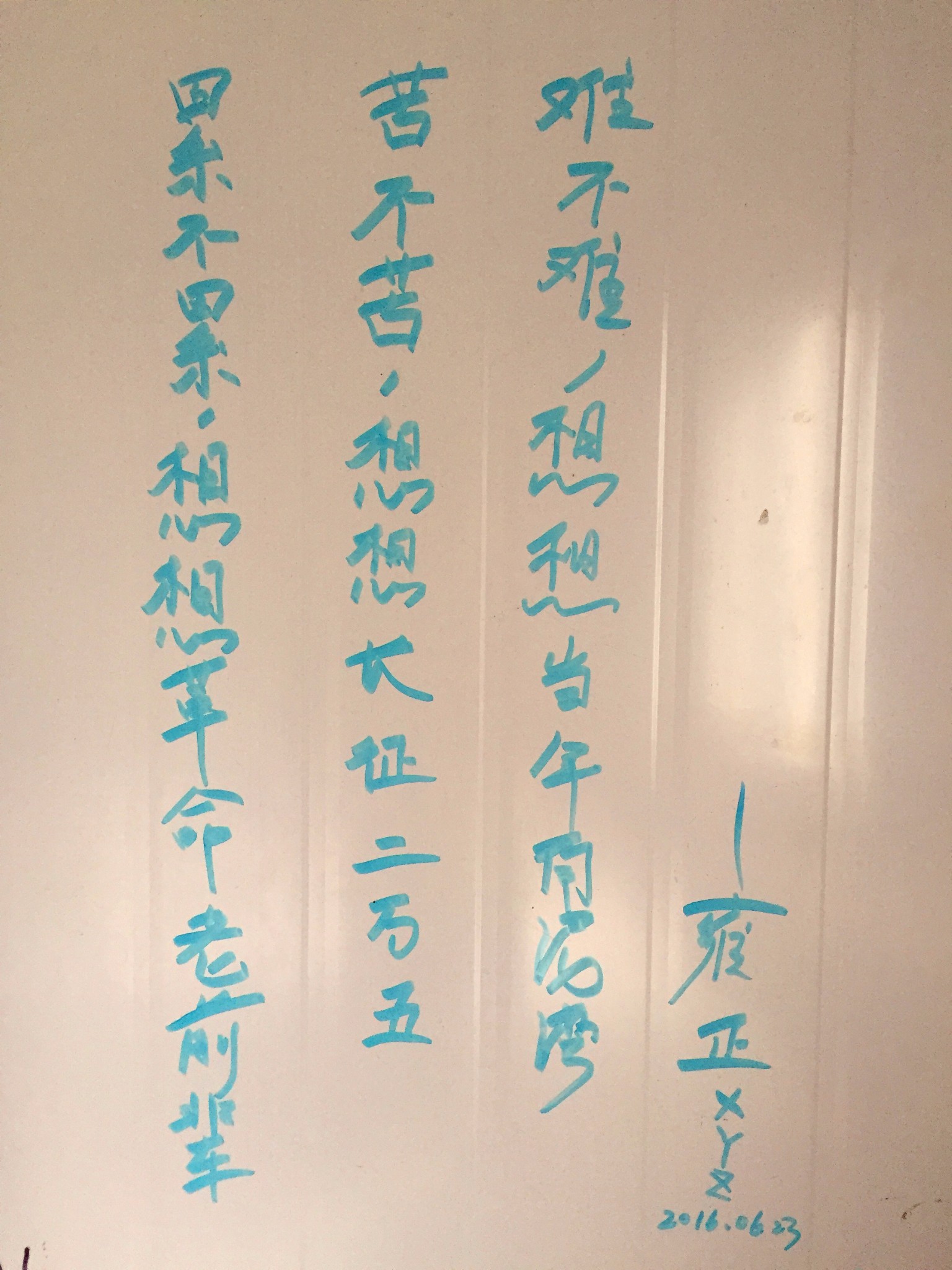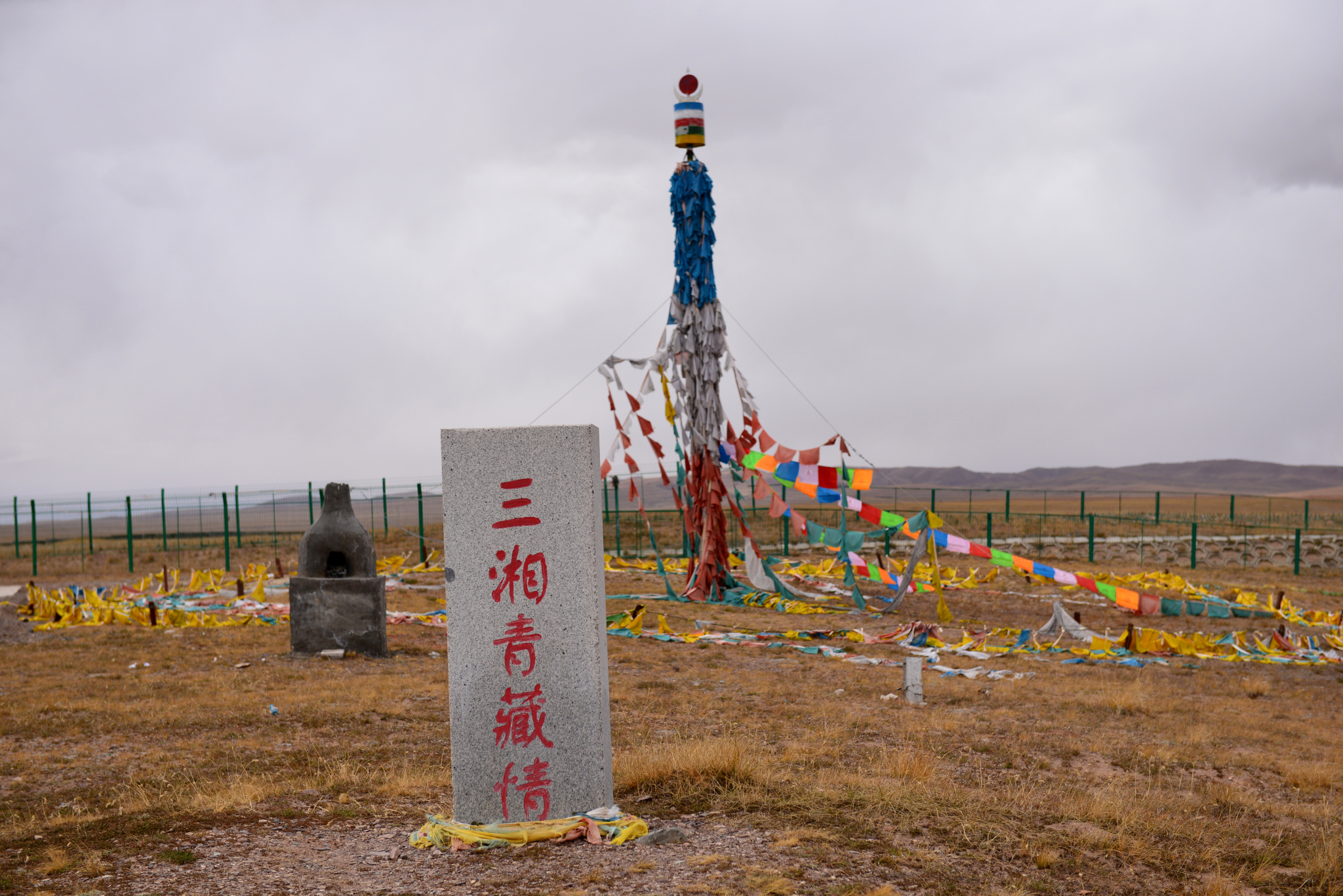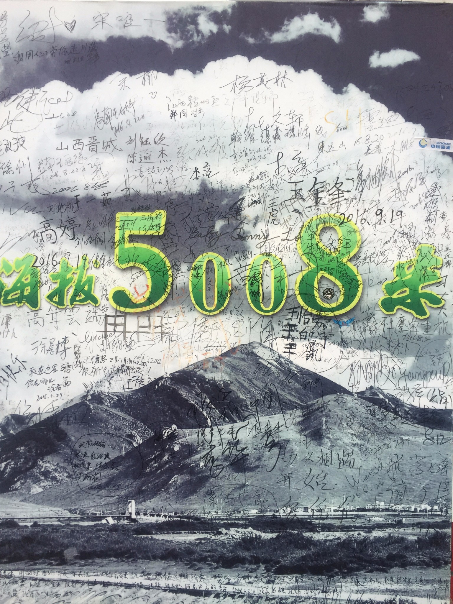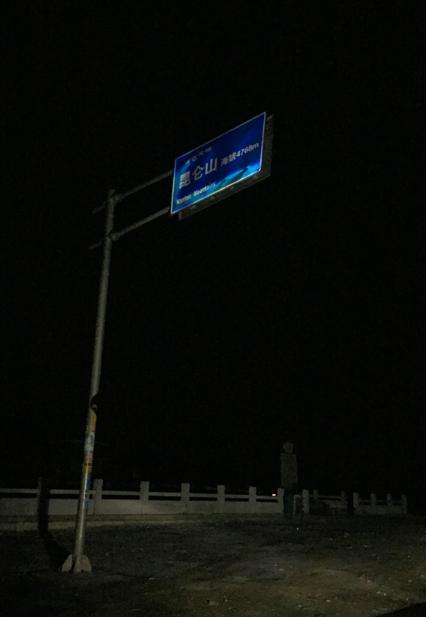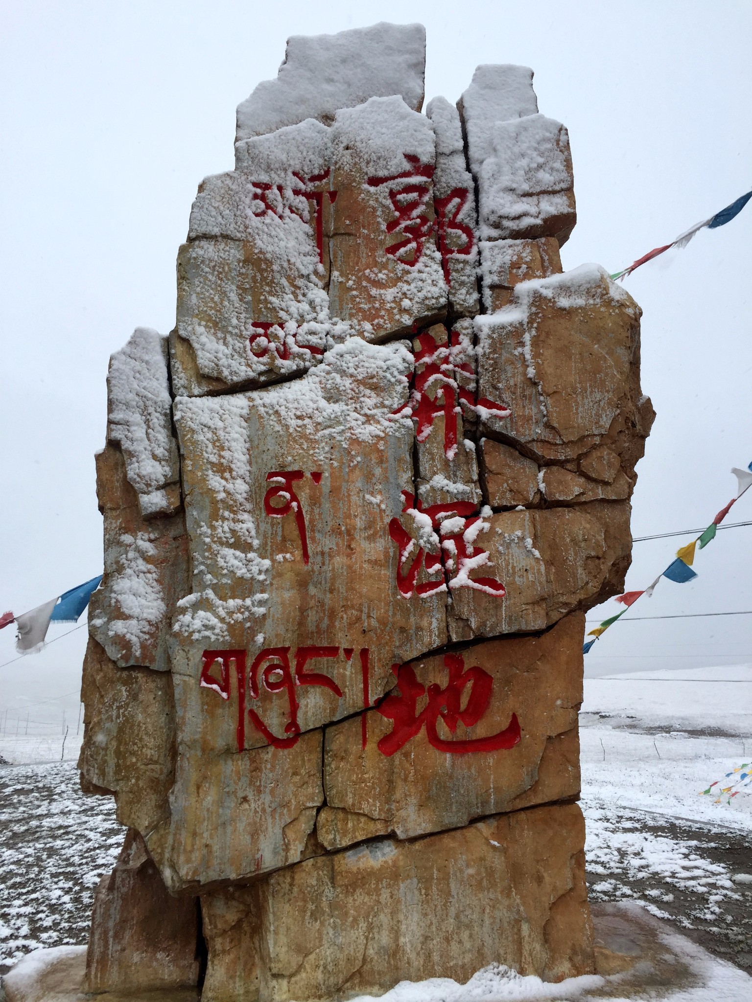 10:01分到倒淌河后,驶出高速进入109国道,翻越日月山,山上白茫茫一片,能见度不足10米,只有路边一块牌子清晰可见,上写“艰苦不怕吃苦,缺氧不缺精神”,本是激励修路工人的话,此时却感到是在激励着我们。
